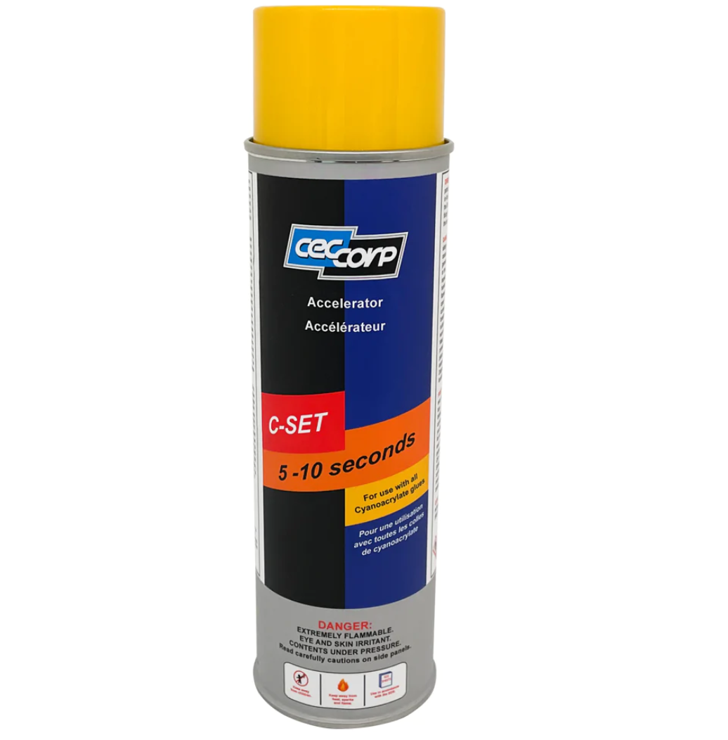 C-SET is a Super Glue Accelerator, also known as a glue “activator” it is used to speed up the drying time of cyanoacrylate super glues. The accelerator is a solvent-based product that can be applied before and/or after the glue application. C-SET Accelerator is commonly paired with high viscosity glues, as thicker viscosity glues take longer to dry. It is also useful when priming uneven surfaces or material combinations that are harder to bond, and in colder drier environments where curing time may be delayed. It comes in a can with a pump sprayer in aerosol form. C-SET Accelerator works well with our C-Bond Thick instant glue.