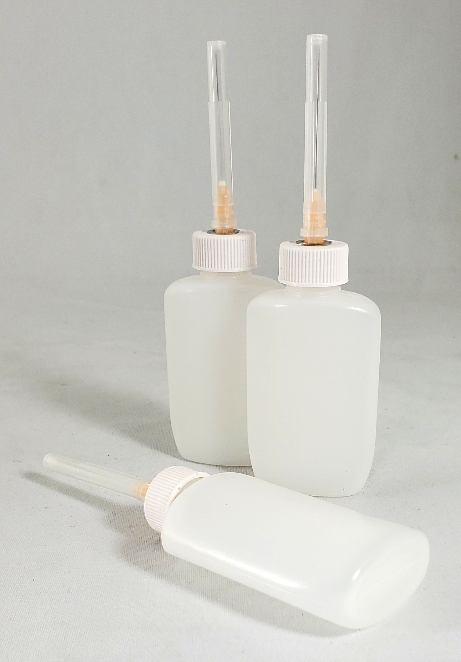 A long needle applicator for solvent cement. A light squeeze of the bottle will start the flow so you can control the amount of solvent applied.