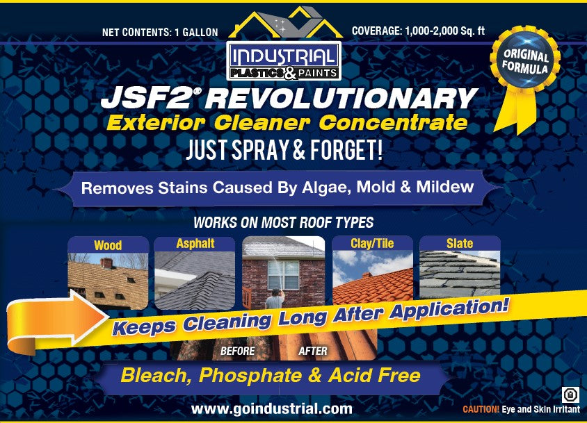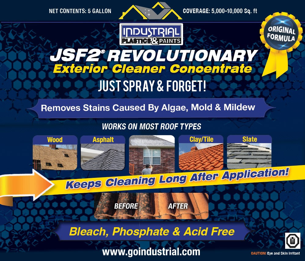 It is a superior product that is easy to use, maintenance free, and only requires one application. JSF2 does not contain bleach, acid, lye or phosphates. Use JSF2 and eliminate the need for damaging pressure washing or laborious rinsing! JSF2 Concentrated Exterior Cleaner is biodegradable, non-corrosive, non-acidic, non-caustic and has a near neutral PH so it will not damage your windows, gutters, awnings, patio furniture or cars!